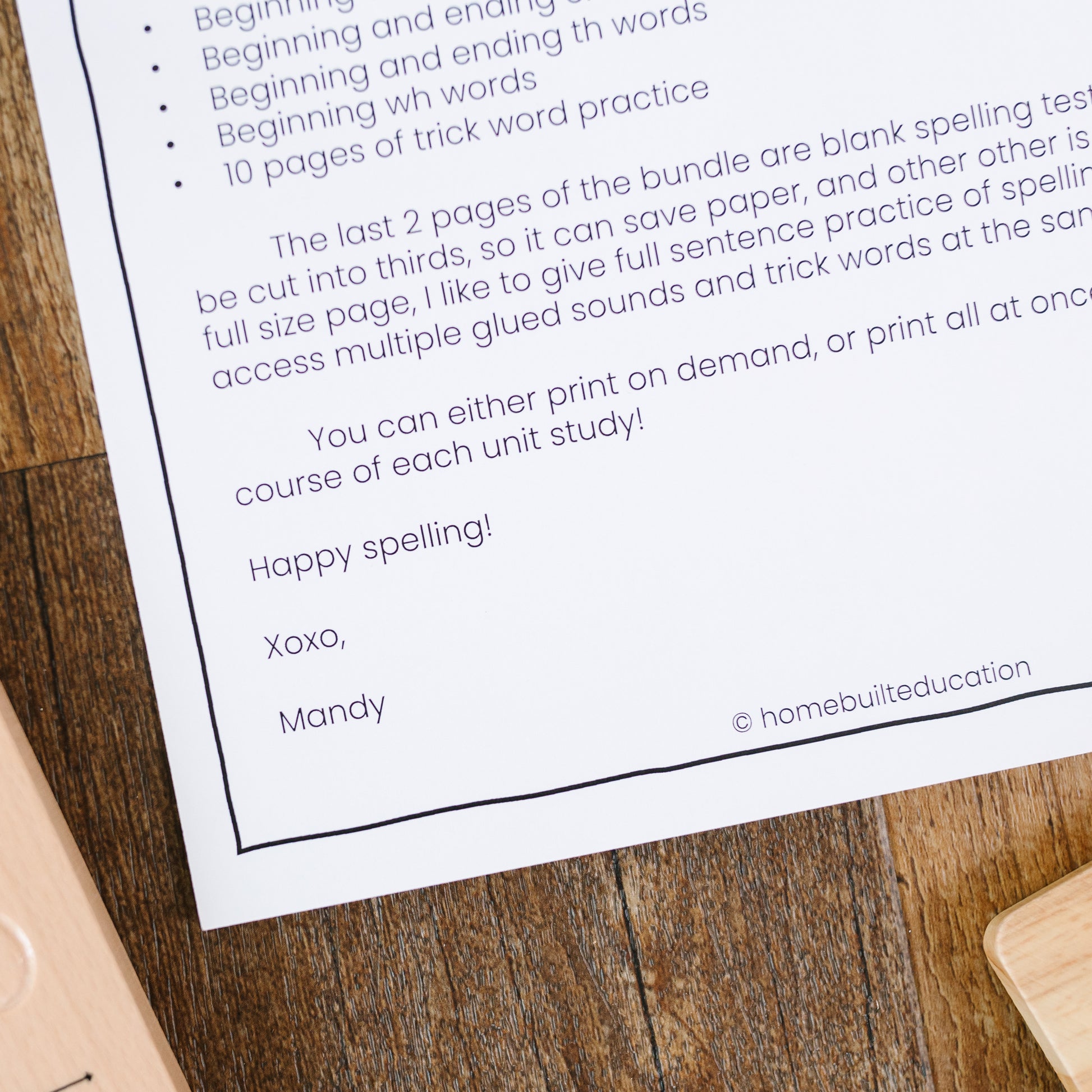 In this spelling bundle, you will find 42 pages of practice that focuses on the development and understanding of glued sounds, digraphs, and trick words (recommended ages 6-8).