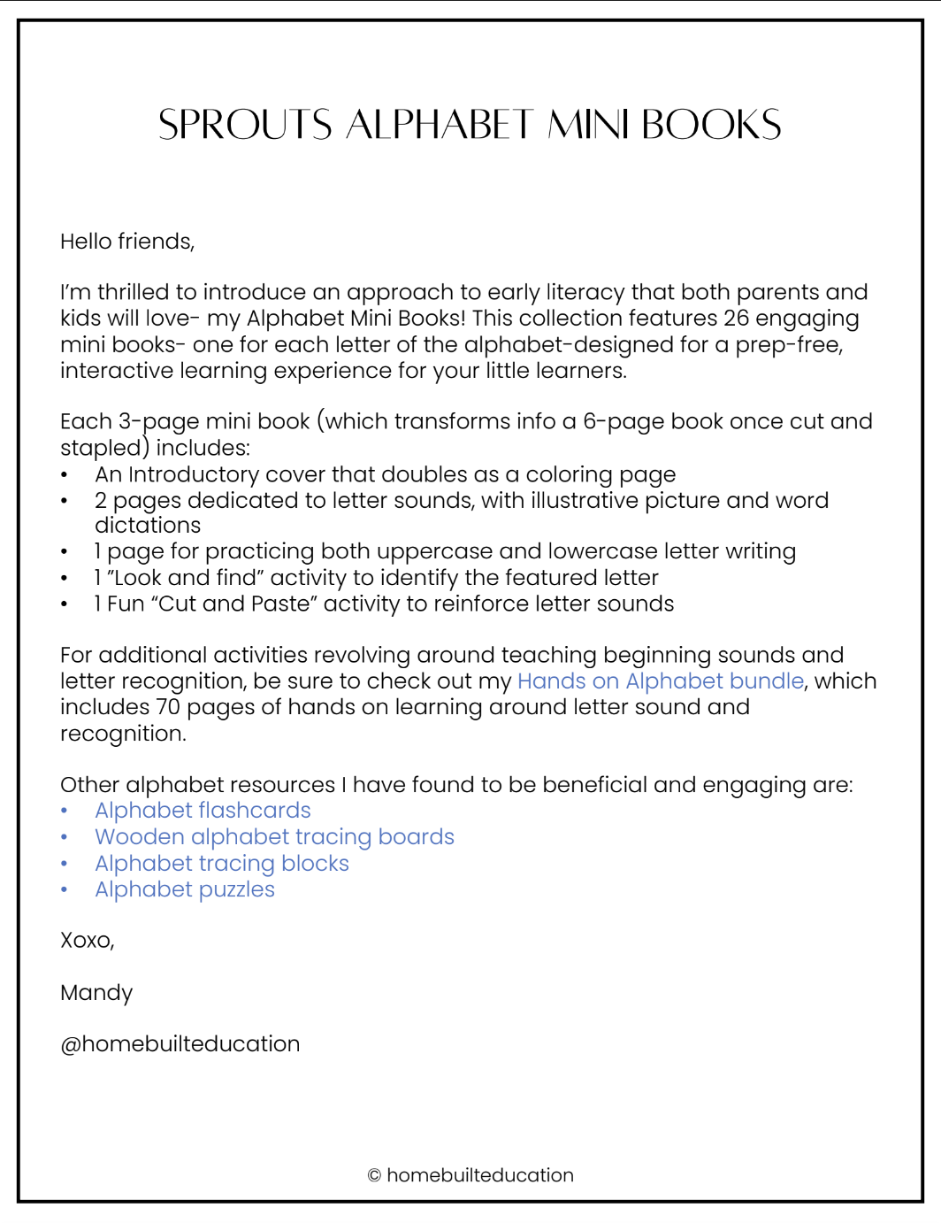 Introduce your little learners to the exciting world of letters with my Sprouts Mini Alphabet Books! Perfectly tailored for children aged 3-5, this set includes 26 creatively designed mini-books—one for each letter of the alphabet. Each book unfolds into 6 interactive pages, providing a fun and engaging way to explore letter sounds and early reading skills. Watch your child delight in the process of cutting and stapling their very own booklets, which they'll use to master the alphabet through a variety of hands-on activities.